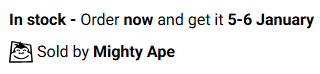 Items that are in stock with one of our suppliers will display the Mighty Ape icon along with “Sold by Mighty Ape” in green. The delivery ETA is typically 2-8 weeks away, and is subject to change depending on stock delays.